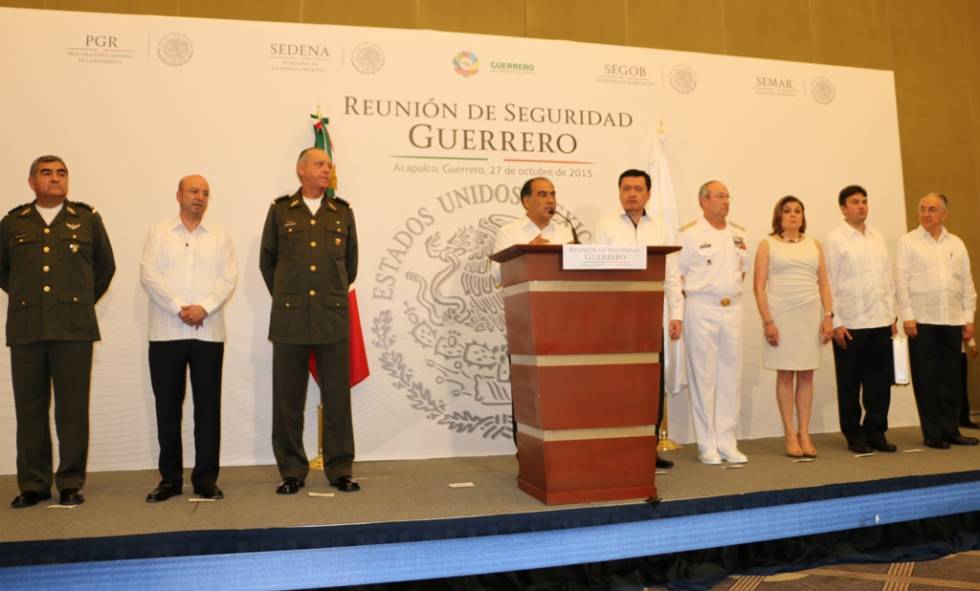 Acapulco, Guerrero, 27 de octubre del 2015.- El gobernador de Guerrero, Héctor Astudillo Flores y los integrantes del Gabinete de Seguridad Nacional, encabezados por el secretario de Gobernación, Miguel Ángel Osorio Chong; la procuradora general de la República, Arely Gómez González; el comisionado Nacional de Seguridad, Renato Sales Heredia; los secretarios de la Defensa, Salvador Cienfuegos Zepeda y de Marina, Vidal Francisco Soberón Sanz y el secretario general del Cisen, Miguel Robles Bárcena, anunciaron un relanzamiento del Plan de Seguridad para Guerrero.