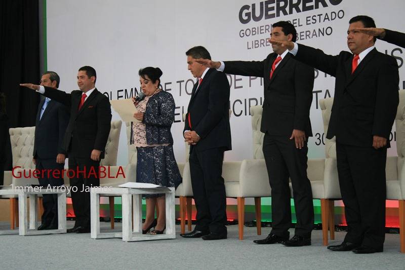 Enseguida honores a la Bandera y canto del Himno mexicano. Luego tomo la palabra la diputada local, Flor Añorve Ocampo, quién a nombre de la 61 Legislatura del Congreso del Estado de Guerrero, y leerles la cartilla de la responsabilidad que implica en cargo, tomó la protesta al licenciado Omar Jalil Flores Majul; “Sí Protesto”.